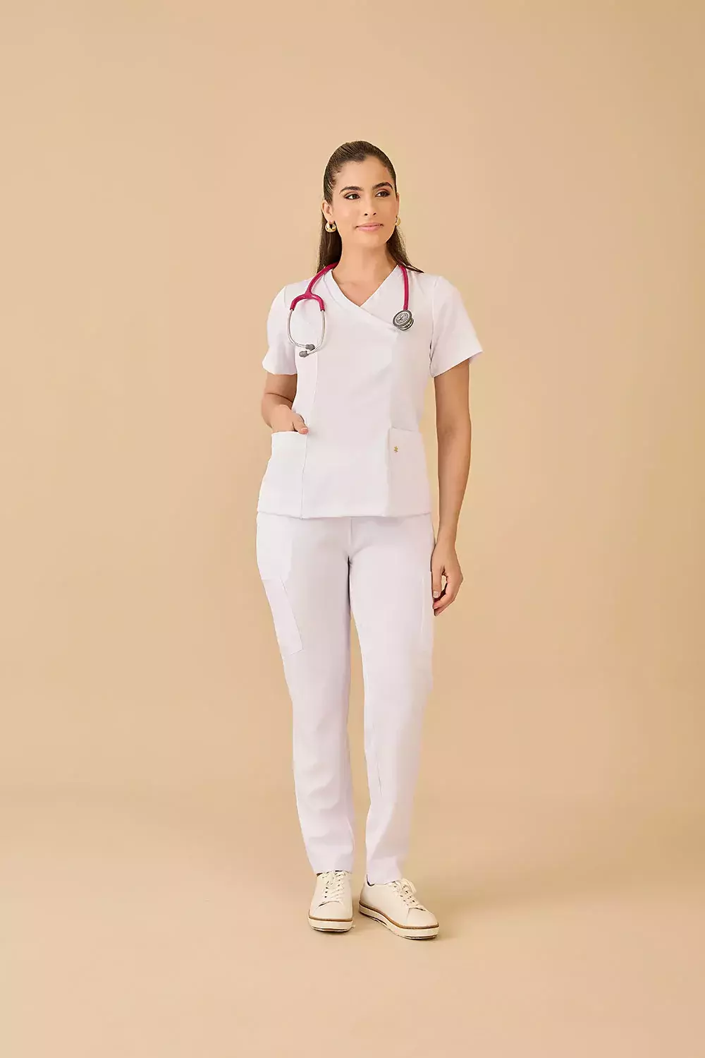 Blusa com gola em V traspassada, dois bolsos frontais e recorte com modelagem perfeita. Calça com pala e elástico na cintura, mais conforto no seu dia a dia. Dois bolsos na frontais e dois na laterais e calça reta.
